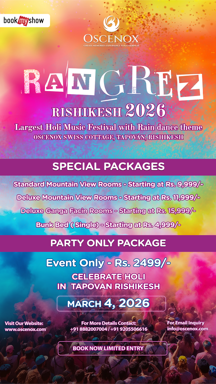 Yes, we host Rangrez 2026 – Rishikesh Largest Holi Music Festival, featuring a high-energy day rave, live DJ performances, rain dance experience, organic Holi colors, festive buffet, premium ambience, and a vibrant celebration at Swiss Cottage by Oscenox in Tapovan.